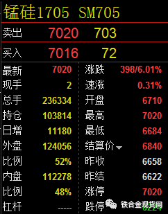 今日(3.15)锰硅1705合约开盘价格6710,收盘价格7020,涨幅6.01%,成交量236334,持仓量103814,日增仓11180。具体情况如下: