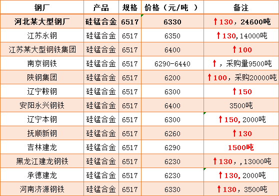 最新:1、建龙集团9月硅锰合金招标价格出台:其中,抚顺新钢9月硅锰合金6517#招标价格出台,为6260元/吨,相较上月上调130元/吨;吉林建龙9月硅锰合金6517#采购价格为6290元/吨,采购数量1500吨;黑龙江建龙钢铁9月硅锰合金招标价格为6230元/吨,相较上月上调130元/吨,采购数量13000吨;承德建龙9月硅锰合金招标价格为6230元/吨,相较上月上调130元/吨,采购数量2000吨;2、河南济源钢铁9月硅锰合金招标价格出台,为6330元/吨,相较上月上调130元/吨,采购数量3500吨。具体如下图所示: