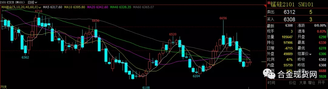 期货市场:今日硅锰期货主力2101合约震荡走势,早盘小幅低开,随后全天围绕日均线上下震荡至收盘,盘中最高点6330点,最低点6278点,成交量较昨日小幅增加,持仓量较昨日大幅减仓4715手,最终录得一根十字小阳K线。技术上看,MACD有效绿柱小幅放大,全天在所有MA均线下方运行,昨日预测,短期或以震荡为主,6250一线有较强支撑,今日符合预期,现货方面:现货报价有一定幅度下调,今日盘面依旧没能有效突破6350一线,短期不排除再次下探6250一线的可能,继续关注消息面的刺激和对盘面的影响,操作建议,小仓位交易,并做好止盈止损。